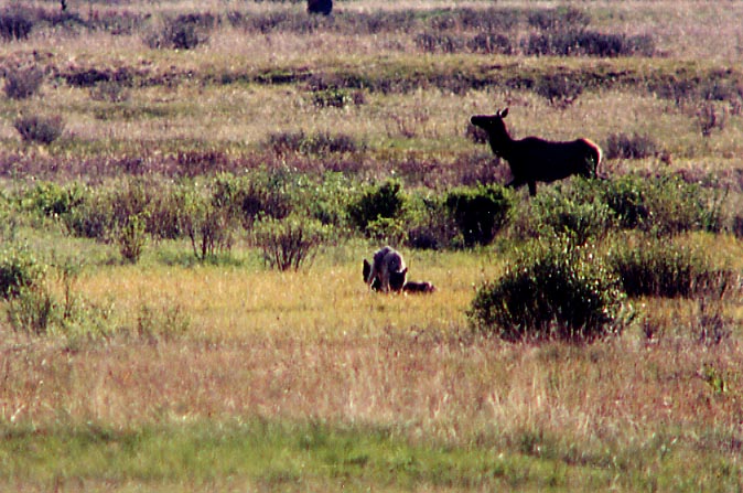 WOLVES FROM THE DRUID PEAK PACK FEED ON AN ELK CALF CARCASS AT ROUND PRAIRIE AS THE ELK COW OF THE CALF PACES NERVOUSLY IN THE BACKGROUND