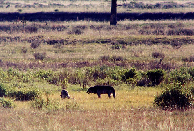 THE ALPHA MALE (#21) OF THE DRUID PEAK PACK ASSERTS HIS DOMINANCE WITH AN OPEN MOUTH OVER A SUBORDINATE MEMBER OF THE PACK WHO HAD MOVED IN ON THE CARCASS WHILE #21 WAS BEDDED