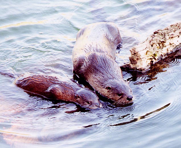 FEMALE RIVER OTTER WITH PUP LAY SIDE-BY-SIDE NEAR THEIR DEN AT TROUT LAKE BETWEEN SODA BUTTE FORMATION AND PEBBLE CREEK CAMPGROUND