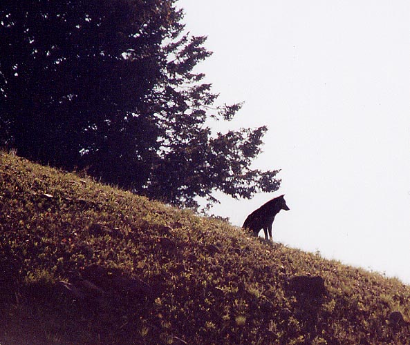 A BLACK YEARLING (POSSIBLY #224) SITS ON THE CREST OF THE RETURN SLOPE AND OBSERVES THE ACTIVITY BELOW IN LAMAR VALLEY