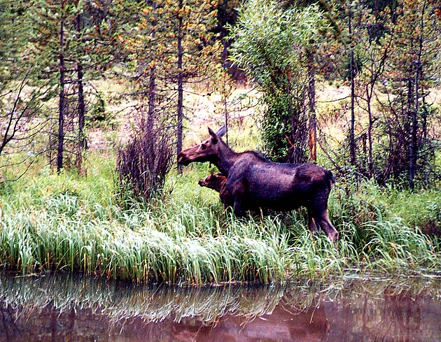 MOOSE WITH CALF IN THE PAHASKA RECREATION AREA NEAR THE EAST ENTRANCE