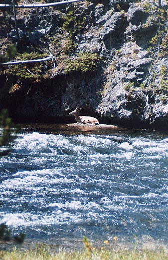 A WHITE-TAILED DEER RESTING ALONG THE BANKS OF THE FIREHOLE RIVER BETWEEN OLD FAITHFUL AND FIREHOLE CANYON DRIVE